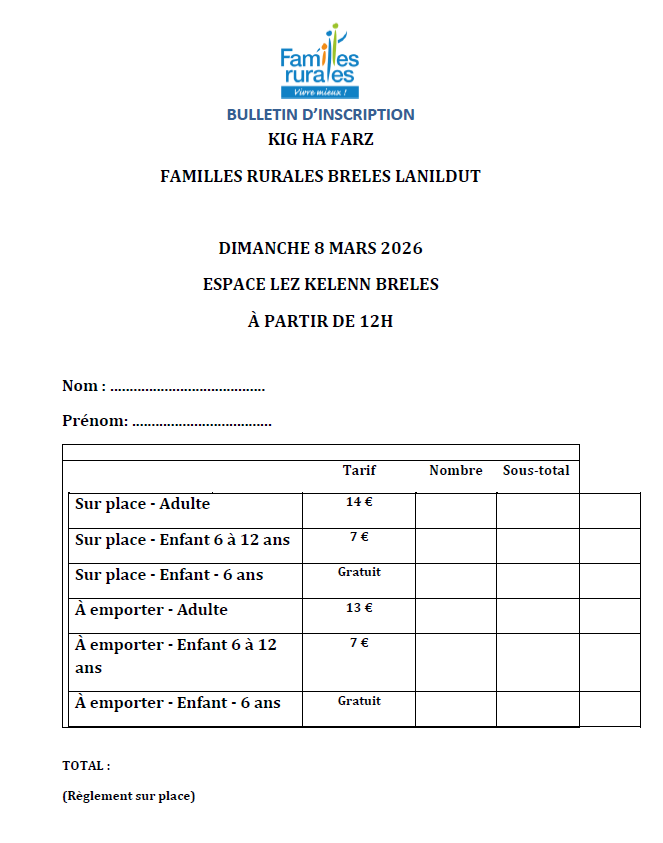 L’association Familles Rurales Brélès Lanildut organise son traditionnel Kig ha farz le dimanche 8 mars à partir de 12h à la salle Lez Kelenn.
